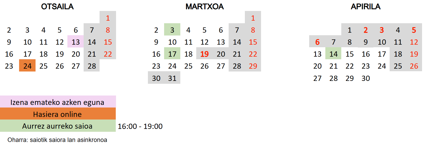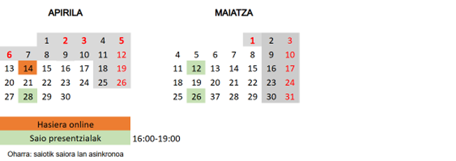 - Aurrez-aurrko 3 saio sinkrono (9 ordu): 3 ordu/saioko – 16:00-19:00